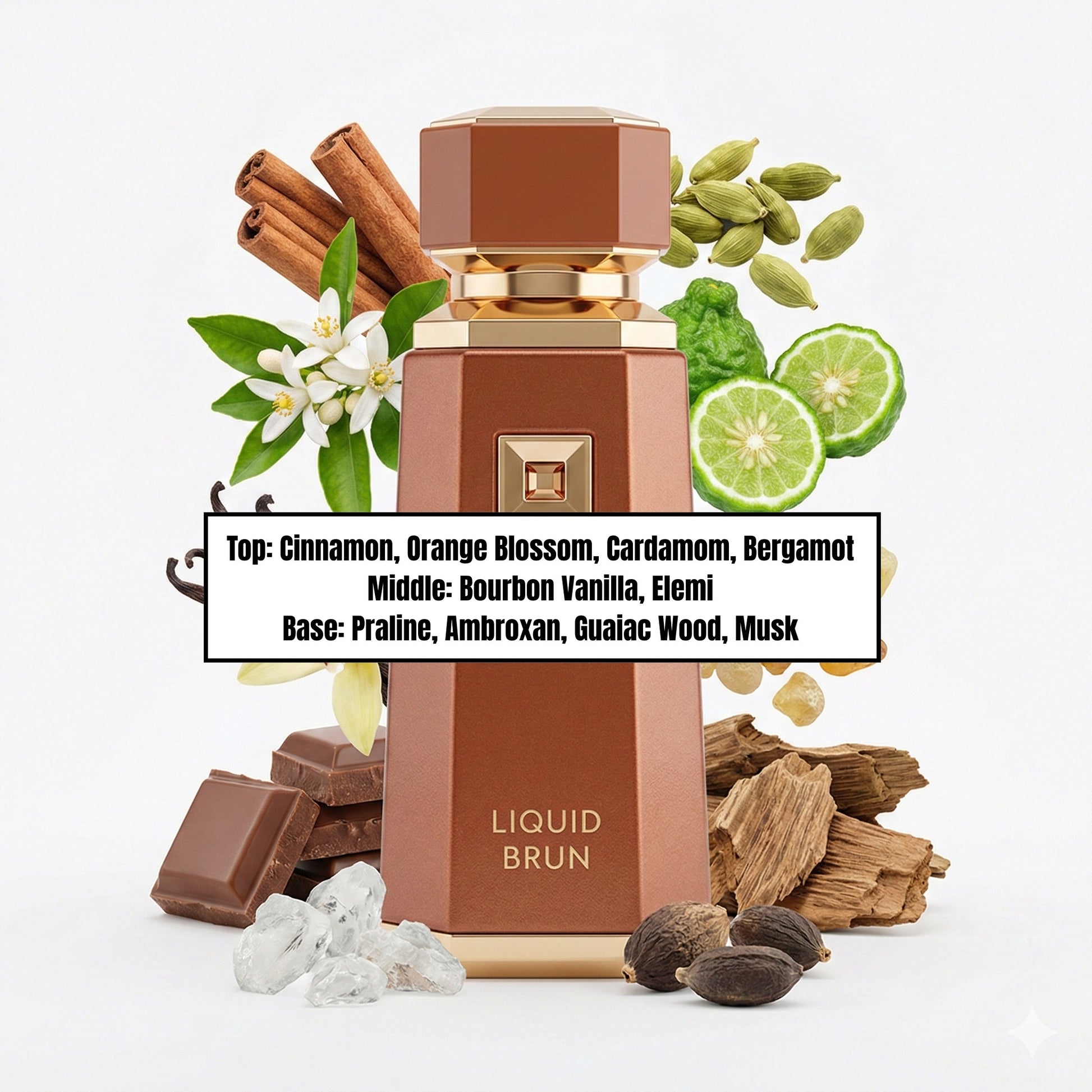 Liquid Brun is the fragrance equivalent of the guy who orders a top-shelf bourbon, knows exactly how to pronounce "Guaiac," and leaves a 50% tip. It opens with a warm, spicy hit of Cinnamon and Cardamom before melting into a ridiculously rich Bourbon Vanilla core. It’s the kind of sophisticated, edible warmth that makes you smell like a walking thirst trap in a tailored coat—effortlessly put-together and dangerously addictive.