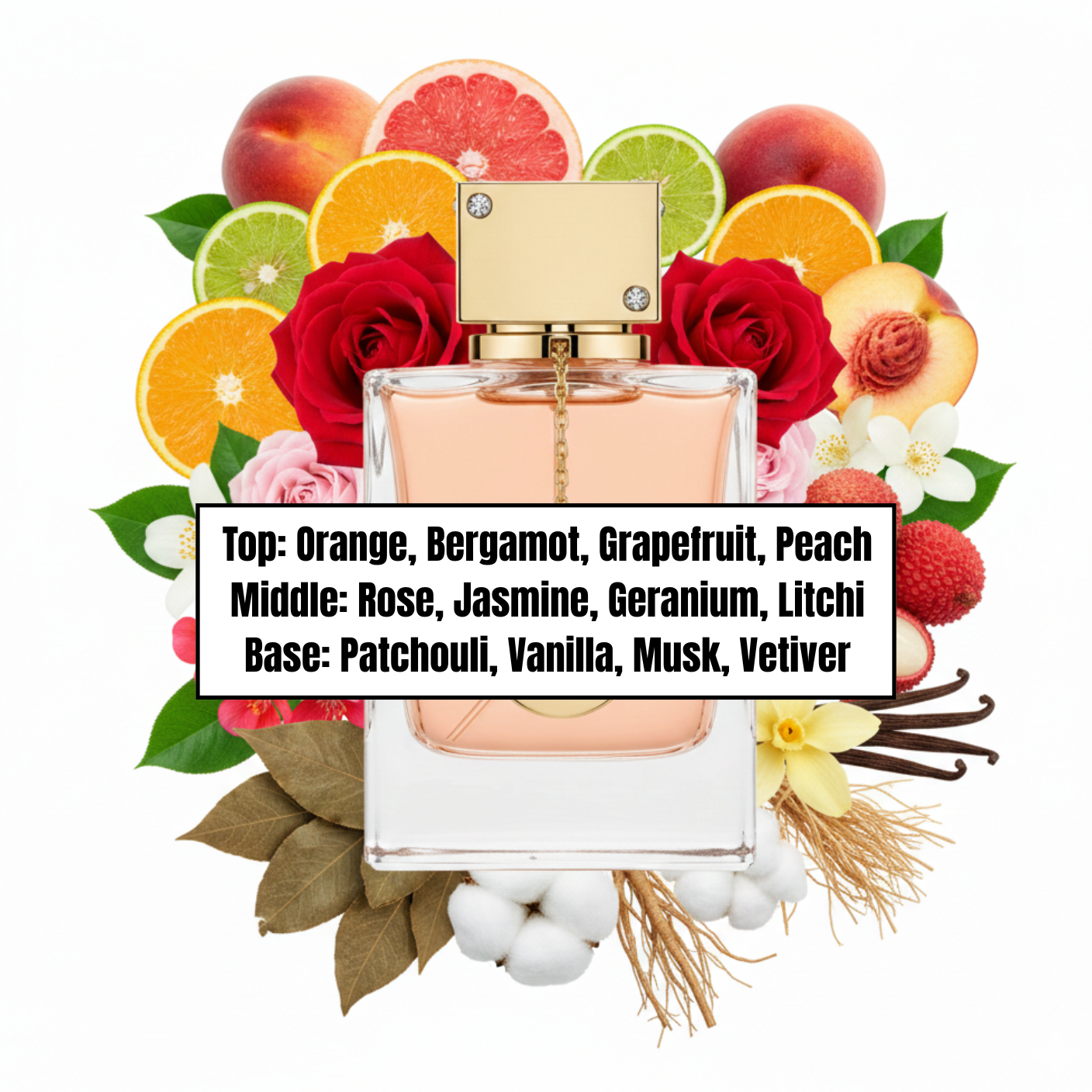 Top: Orange, Bergamot, Grapefruit, Peach